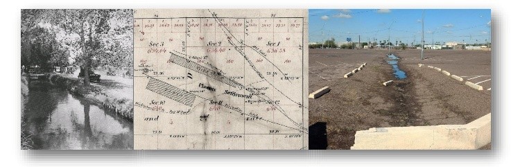 Caption: Left, the Salt River Valley Canal in downtown Phoenix ca. 1920s; center, portion of a General Land Office plat map showing some canals in the original Phoenix townsite; right, traces of the historic Maricopa Canal in Phoenix; photos courtesy of Dan Garcia and Salt River Project